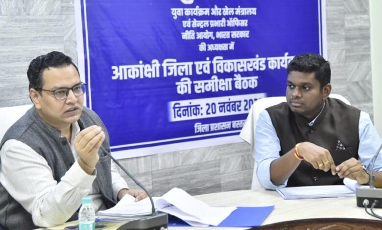नीति आयोग द्वारा नियुक्त बस्तर जिले के नोडल अधिकारी एवं संयुक्त सचिव शोभित जैन ने बस्तर आकांक्षी जिला और ब्लॉक कार्यक्रमों की प्रगति की समीक्षा बैठक जिला कार्यालय के आस्था सभाकक्ष में ली। बैठक में कलेक्टर हरिस एस ने जिले और ब्लॉक में आकांक्षी कार्यक्रम के अंतर्गत योजनाओं के क्रियान्वयन के संबंध में विस्तृत जानकारी दी और समस्याओं के संबंध में भी अवगत करवाया।
