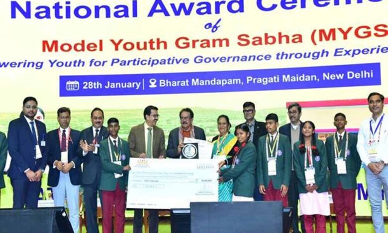 नई दिल्ली में 28 जनवरी, 2026 को मॉडल यूथ ग्राम सभा (एमवाईजीएस) पुरस्कार समारोह आयोजित हुआ। इसमें देश के विजेता स्कूलों और छात्रों को सम्मानित किया गया। समारोह में केंद्रीय पंचायती राज राज्य मंत्री प्रो. एस.पी. सिंह बघेल और केंद्रीय शिक्षा राज्य मंत्री डॉ. सुकांत मजूमदार शामिल हुए।