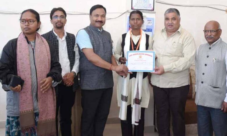 पर्यटन मंत्री राजेश अग्रवाल ने हैमर थ्रो में राज्य स्तर पर तृतीय स्थान प्राप्त करने वाली छात्रा सुधा सिंह को किया सम्मानित
